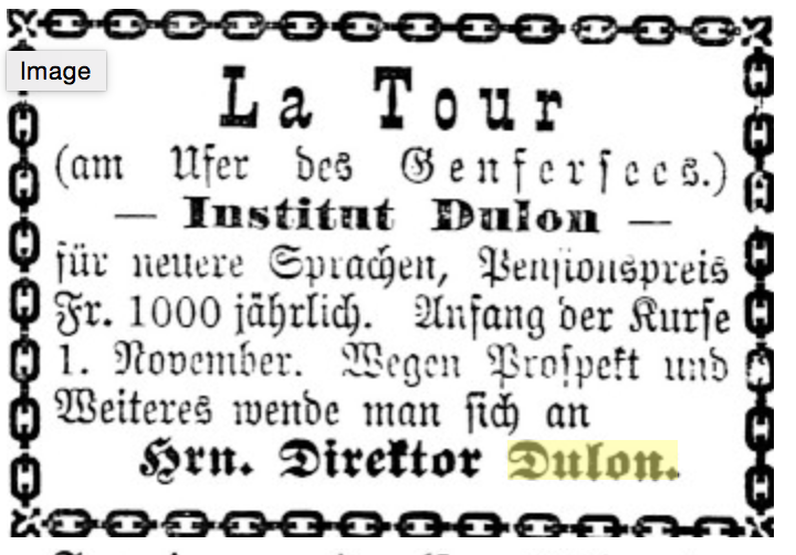 Il aurait même volé à Courbet la somme de 1200 fr. (Lettres GC 76/5 – 9 février 1876 Chu p. 496) dépassant même le prix annuel d’une pension pour un étudiant à l’Institut Dulon. Régis Courbet, père de Gustave, ne portait pas le pasteur Florian Dulon dans son coeur. Il avait déjà tout deviné la malhonnêteté de Florian Dulon. L’homme d’église s’était fixé à La Tour de Peilz dès 1870. Il a tenu pension dans sa maison (Pension Bellevue) et a été Conseiller Municipal Libéral à La Tour-de-Peilz, officier d’état civil et Député au Grand Conseil en 1874 et 1876. Contrairement à ce qui a été écrit sur Courbet, la Pension Bellevue Dulon n’est pas le 1er refuge du peintre en Suisse puisque que Courbet a d’abord vécu plusieurs semaines en Valais, dans les Moulins de Saillon.