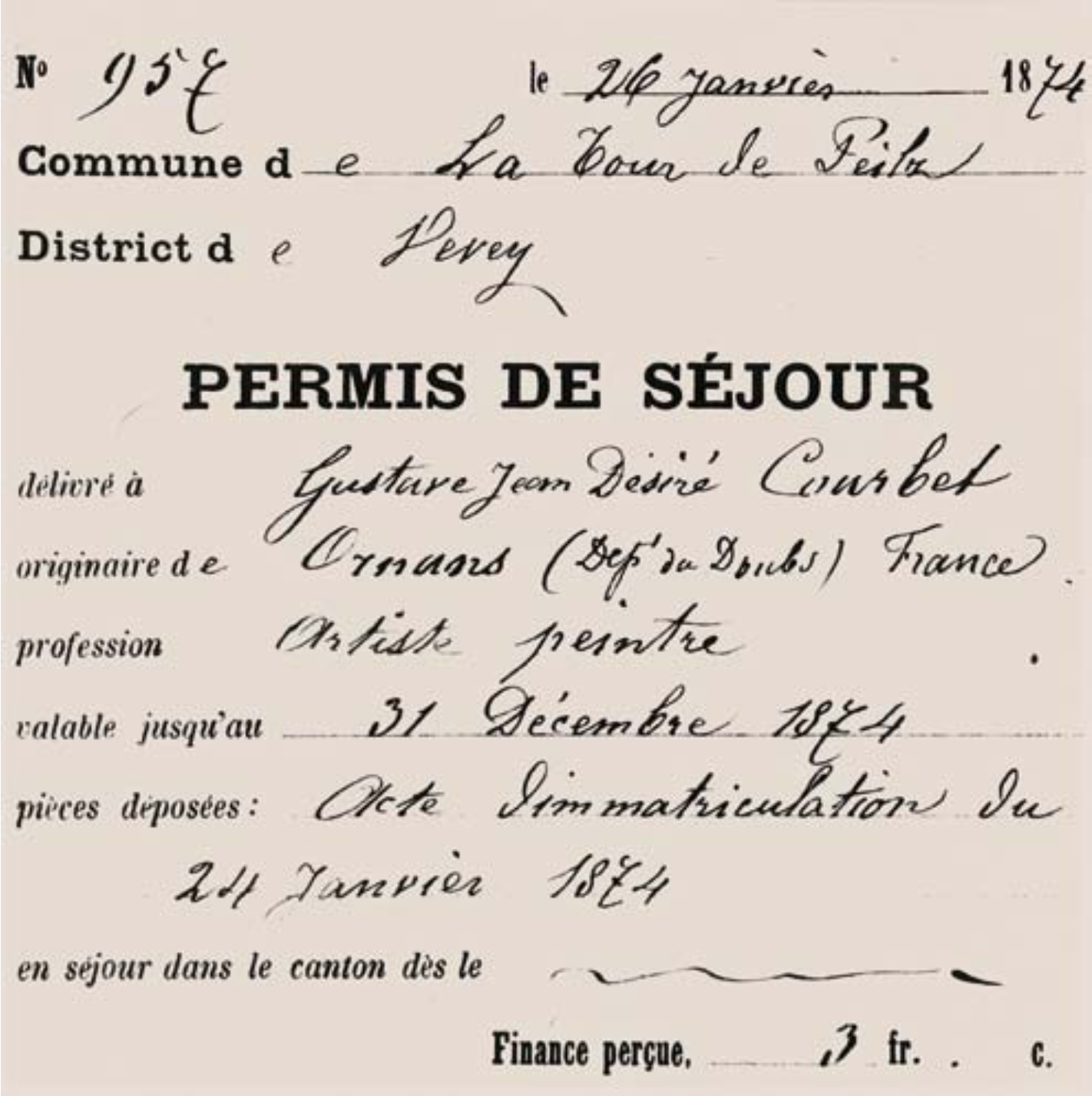 Le 24 janvier, Gustave Courbet dépose ses papier à La Tour-de-Peilz. (Archives communales de La Tour-de-Peilz, Registre des permis de séjour.