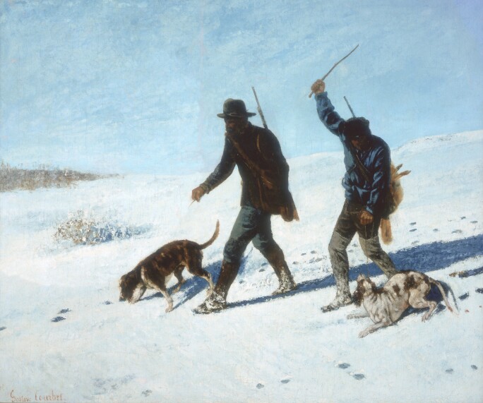 L’abondante neige qui tombe sur la Franche-Comté pendant l’hiver 1866-1867 inspire à Courbet tout un ensemble de tableaux. Il écrit au marchand Bardenet le 31 janvier 1867 : « J’ai une série de paysages de neige qui sera semblable à celle des paysages de mer ». Plusieurs d’entre eux – dont La Pauvresse de village – sont présentés à son exposition personnelle à Paris au printemps 1867. Certains sont des scènes de chasse, d’un esprit très différent. En revanche, une superbe toile de la même année et de format similaire comporte de nombreux points communs avec La Pauvresse de village, il s’agit de Braconniers dans la neige (fig. 3, 1867, Galleria Nazionale d’Arte Moderna, Rome, inv. CAL-F-005676-0000) montrant deux silhouettes sombres se détachant sur un fond de neige d’une luminosité aveuglante.