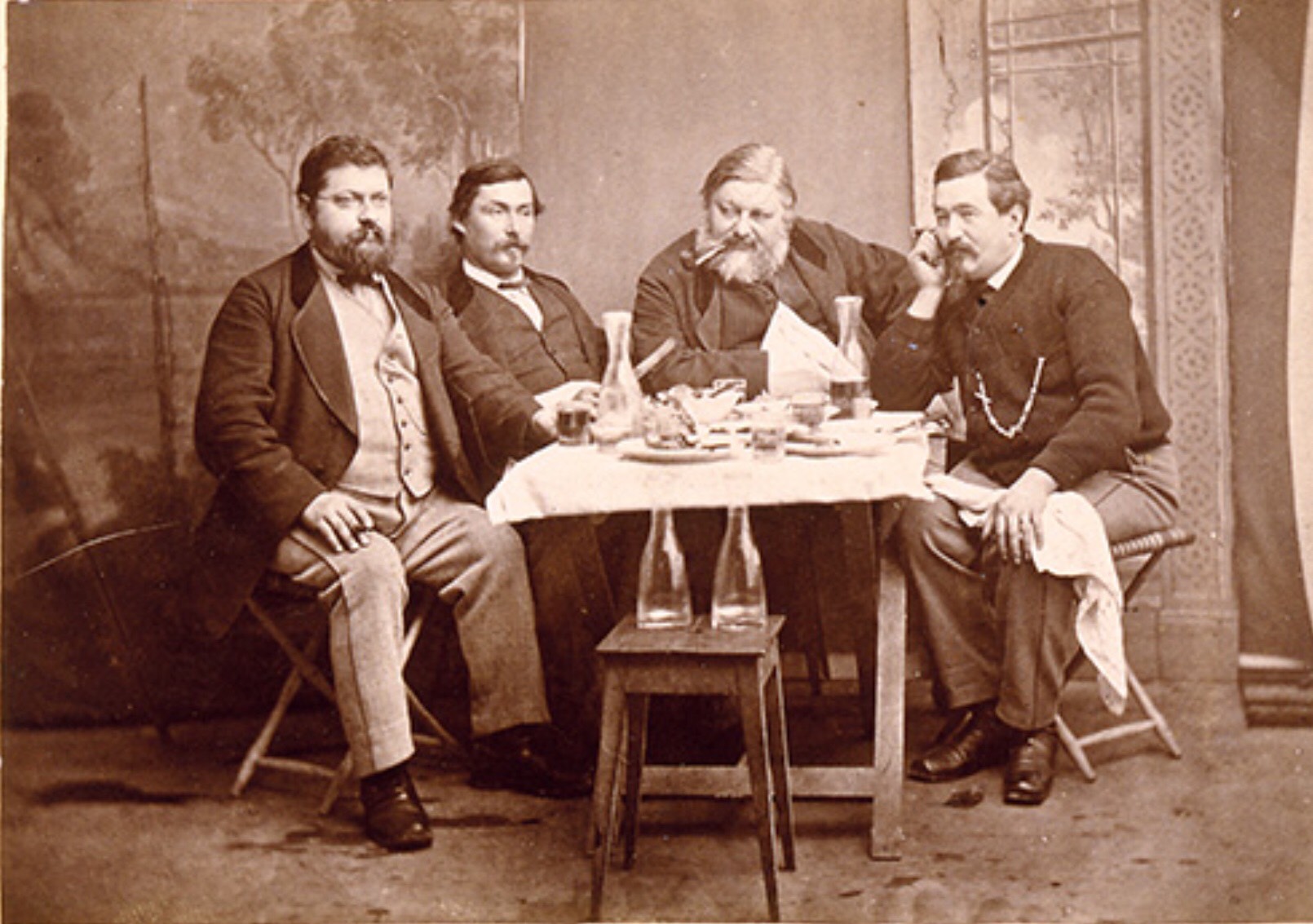 De gauche à droite : Melchior Seeberger (directeur de la fanfare), Maxime ou Max de Gapany (Capitaine des carabiniers), Gustave Courbet (peintre) et Louis Weitzel (négociant à l’esprit frondeur).